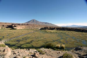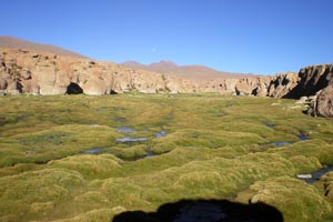 Les bofedales sont des systèmes écologiques très humides où la végétation forme des sortes de coussins d'herbe et d'autres plantes semi aquatiques agglutinées, on ne les trouve qu'au delà de 4000 mètres d'altitude... C'est un habitat naturel duquel dépend une partie importante de la flore et de la faune des regions andines et en saison sèche, l'unique endroit où peuvent aller paître les troupeaux de camélidés, qu'ils soient domestiqués comme le lama ou l'alpaca, ou sauvages comme la vicuña. On trouve des bofedales naturels, formés dans des dépressions géologiques par la fonte des eaux et les pluies des saison humides mais aussi des bofedales artificiels pour lesquels il faut entre 5 et 10 ans d'innondation permanente couplé avec un contrôle très strict des troupeaux et de la charge animale sauvage. |