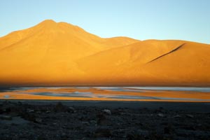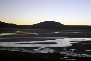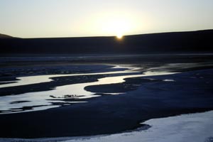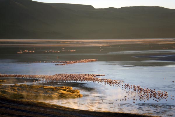 L'autre monstre du Sud Lipez, la laguna colorada... Avec Manu nous nous sommes levés à 4H30 du matin pour marcher une heure dans un froid polaire afin de voir le lever de soleil sur la lagune, et il faut avouer que ça valait la peine... On s'est pelé comme jamais mais quelle beauté, puis quel plaisir aussi d'avoir le site pour nous tous seuls, de voir les flamants groupés par milliers à quelques mêtres de la berge, là où quelques sources d'eau chaude garantissent une eau à 10° au lieu de 2 ou 3... Magique moment de l'astre qui se lève et qui ne réchauffe pas autant qu'on le souhaiterait...