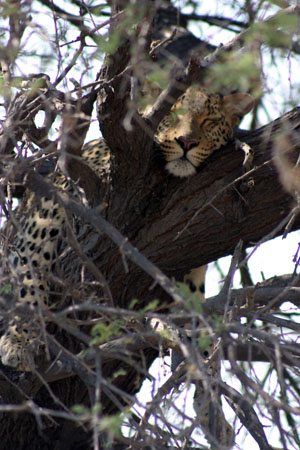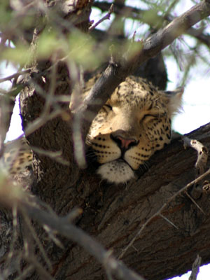 Un prodigio, la movilidad avanza en la pista cuando mi ojo se deja atraer por una figura. Damos la vuelta atrás, cautelosos. Un leopardo está tranquilamente recostado sobre la tierra, a menos de 5 metros de nosotros. Se levanta, se sienta un rato, contempla el paisaje. Luego se acerca suavemente a un árbol al borde de la carretera, en una lentitud fascinante. Mira el árbol y salta de repente hacia una rama horizontal donde se recuesta, con una flexibilidad admirable, antes de empezar una siesta. Cuando contamos esto al dueño de la residencia, quedó impresionado porque nos contó que en 35 safaris, podía contar con los dedos de sus manos las veces que había divisado un leopardo. ¡divisado! Me acuerdo que mi guía en Tanzania nos mostró una cosa medio manchada en un árbol una vez, a unos 100 metros diciendo que habíamos tenido suerte de ver a uno. ¡Que hubiera dicho este día en Namibia! |